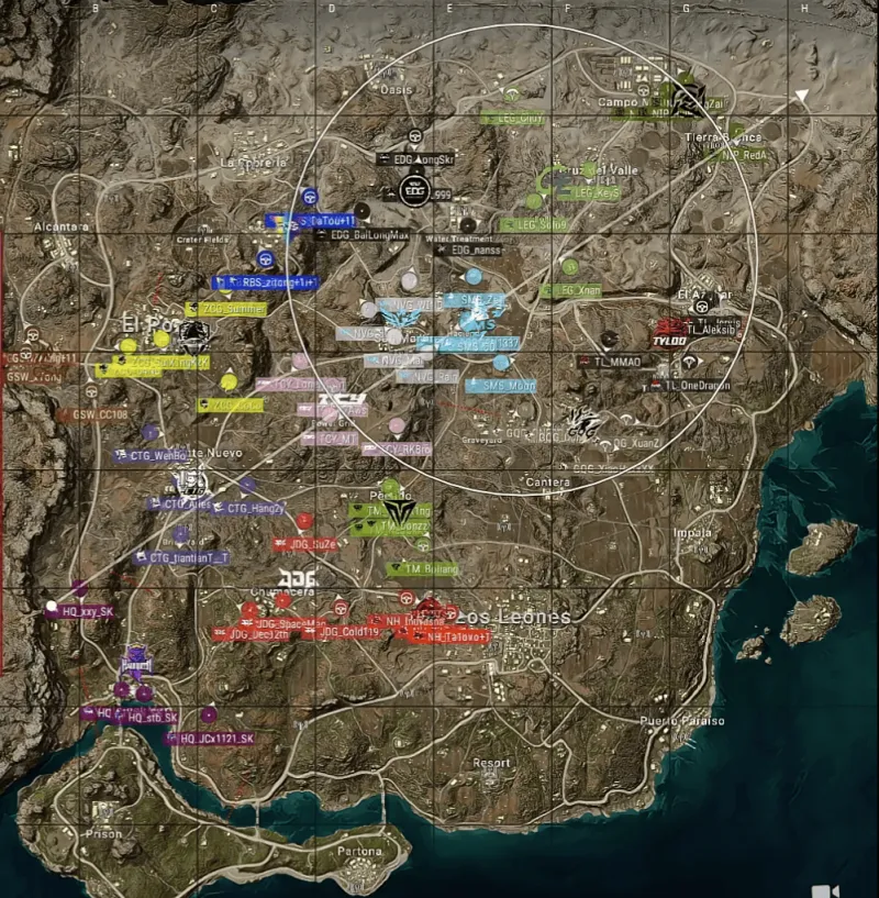 阶段6剩余6队,EDG、GSW、ZCG三队在圈外交火,EDG先打掉GSW独狼,另一侧,JDG和TCY也进行交火,JDG轻松炸掉TCY三人,随后ZCG打掉EDG后自己也被JDG和TM夹击淘汰。