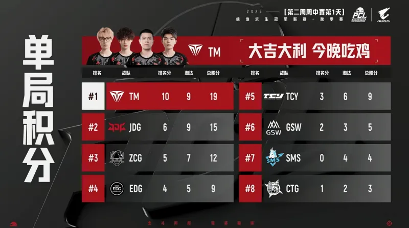 虎扑09月10日讯 2025PCL秋季赛第二周小组赛第一日第六局比赛结束,本局战况如下:点我为今日比赛选手评分,评选每日最佳选手>>本局地图:米拉玛前四队伍:TM JDG ZCG EDG吃鸡队伍:TM跳点情况:本局决赛圈位于Cruz城南侧。阶段6剩余6队,EDG、GSW、ZCG三队在圈外交火,EDG先打掉GSW独狼,另一侧,JDG和TCY也进行交...